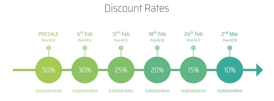 bakal ngajalankeun liwat hiji periode 31 poé dimimitian ti 6 Pébruari 2018 dugi 9 of rounds Maret 2018.The baris nuluykeun dugi cap ti 33,1 mln USD ieu pencét atawa babak final expires.During nu token Sale REPUX bisa dibeuli di tukeran pikeun ETH, BTC atanapi Kawat Transfer, kalawan minimum kontribusi USD 100 (atawa sarua jeung 100 USD di BTC atanapi ETH). Salila Pra-Sale, sumbangan minimum anu 30.000 USD.